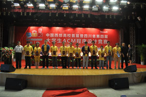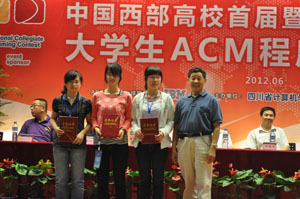 6月2日下午,中国西部高校首届暨四川省第四届大学生ACM程序设计竞赛闭幕式暨颁奖典礼在学院大学生活动中心举行。出席闭幕式的领导和嘉宾有:四川省计算机学会秘书长、高级工程师文德生,四川省计算机学会副秘书长、高级工程师宋昌元,四川省计算机学会副理事长、西南民族大学计算机学院院长、教授杨宪泽、学院副院长曹云凤教授、学院院长助理兼教务部部长康桂花,学院计算机科学与技术系主任杨瑞良,学院计算机科学与技术系党总支副书记贾骐。闭幕式由计科系常务副主任巫家敏博士主持。
