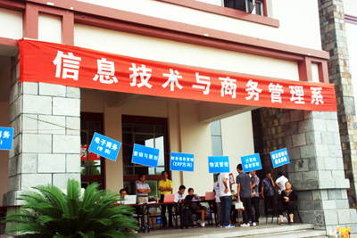 信息技术与商务管理系的工作人员热情地为新生及家长服务