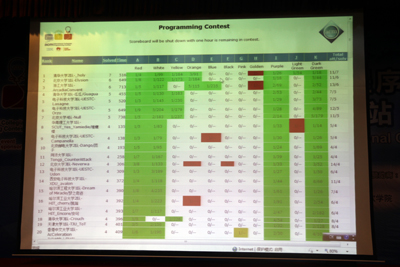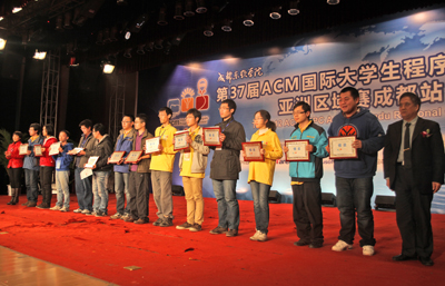 随后,主持人阿丘以他一贯风趣幽默的主持风格宣布了获奖名单。其中,获得铜牌的学校和代表队共45支队伍,包括合肥工业大学1队、国防科技大学1队、重庆大学1队等,学院计科系常务副主任巫家敏和党总支副书记贾琪为选手颁发了获奖证书;获得银牌的学校和代表队共30支队伍,包括同济大学1队、北京大学3队、浙江理工大学1队等,院长助理兼教务部部长康桂花和计科系主任兼党总支书记杨瑞良为选手颁发获奖证书;获得金牌的学校和代表队共15支队伍,包括华南理工大学1队、电子科技大学2队、北京大学1队等,中国区指导委员会秘书长周维民教授、IBM中国区大学关系经理周恩昌先生、学院副院长曹云凤教授、学院副院长张辉教授和达内科技人才服务中心直辖区副总经理李旻为选手颁发了获奖证书。此外,获得拼搏奖的队伍共2支队伍,分别是宁波大学1队,西南财大1队;获得最快解题奖的学校和代表队共8支队伍,包括电子科技大学6队、电子科技大学2队、北京大学1队等,均由大赛的裁判长—学院ACM总教练余新桥博士和大赛命题组组长、复旦大学孙未未博士为选手颁发证书。