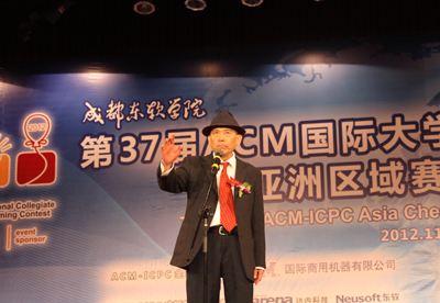闭幕式上,ACM国际大学生程序设计竞赛主席黄金雄教授作了重要讲话。他对成东软学院承办此次ACM大赛表示衷心感谢,并高度肯定了学院在此次大赛中付出的辛劳和汗水。他提到毛泽东主席的“幸福大道”观以及曾任美国总统的罗斯福说过的“人生最大幸福和恩赐就是做你自己喜欢做的事,并且认真去做”,并用两位伟人的话激励在座学生勇敢秀出自己的才能,发扬ACM大赛的精神,在人生舞台上创造辉煌。