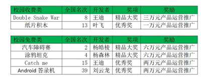 09级可视化专业叶飞同学和11级软件技术专业杨皓棱同学共同开发的《汽车障碍赛》获得校园免费组全国第二名,奖项为精品大奖,获得了6万元运营推广费用;09级可视化专业叶飞同学和10级日语强化专业杨森林同学共同开发的《涂鸦坦克》获得校园免费组全国第四名,奖项为精品大奖,获得了6万元运营推广费用;11级移动互联专业王迪同学和11级影视动画专业邹雪石同学共同开发的《Catch Me》获得校园免费组全国第十五名,奖项为优秀奖,获得了2万元运营推广费用;11级软件技术专业刘云龙同学开发的《Android答录机》获得校园免费组全国第三十九名,奖项为优秀奖,获得了2万元运营推广费用;11级移动互联专业王迪同学和11级软件技术专业杨皓棱同学共同开发的《Double Snake War》获得校园收费组全国第八名,奖项为精品大奖,获得了3万元运营推广费用;09级可视化专业叶飞同学与10级日语强化专业杨森林同学共同开发《纸片积木》获得校园收费组全国第十八名,奖项为优秀奖,获得了1万元运营推广费用。
