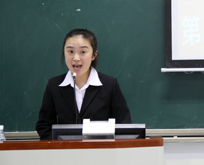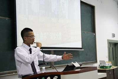 在主持人宣布了比赛原则、评分规则及注意事项后,参加决赛的选手开始了精彩对决。首先上场的一号选手先声夺人,精彩的演讲为大赛拉开了精彩帷幕。二号选手邱苏林同学用精彩而富有感染力的演讲博得了在场观众的阵阵掌声。而接下来各位选手亦实力非凡,有的演讲题材新颖、言辞恳切,有的落落大方,充满激情,有的内容充实,语言丰富。台下师生纷纷为参赛选手送上了掌声。