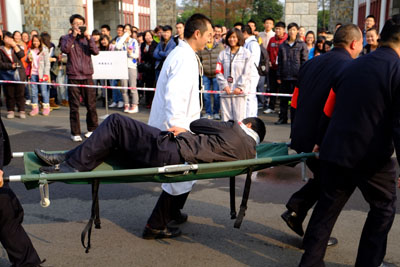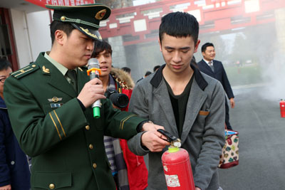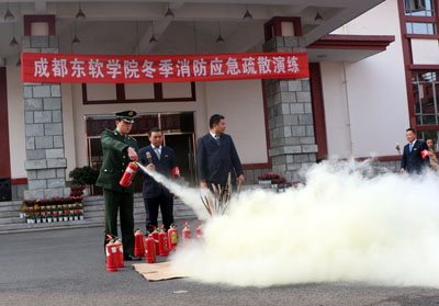 疏散演练结束后,都江堰市消防大队吴竞参谋为同学们介绍了应急情况下的常用逃生手段和开展此次消防演练的重要意义,使同学们进一步提高了对消防安全的认识。吴参谋还现场示范讲解了ABC型灭火器的使用方法和注意事项。并让同学们现场体验灭火过程,使同学们对消防灭火实践有更加深刻的体验。