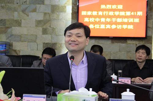 4月14日上午,国家教育行政学院第41期高校中青年干部考察团团长、北京交通大学教务处处长李长春携21所高校中青年干部代表莅临学院考察。学院党委书记、院长张应辉教授,党委副书记张宪民,副院长张辉教授,院长助理、教务部部长康桂花,党委办公室主任易胜华及相关部门负责人热情接待了各位考察领导。
