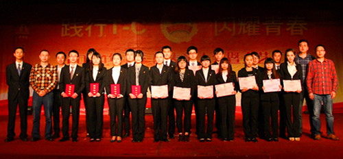 精彩的歌舞表演之后,学院党委委员、学工部部长程学良,团委书记、学工部副部长蒋利明,信管系党总支副书记沈洪科,外语系党总支副书记罗玺, SOVO中心主任罗剑波为17个先进团支部代表颁奖。