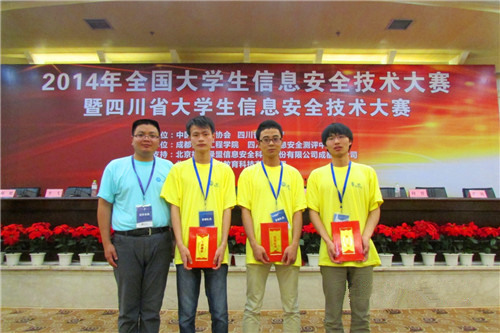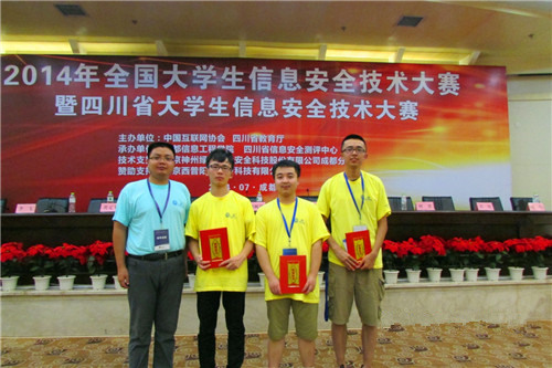学院代表队由计科系信息安全专业教师周让老师带队,信息安全技术专业12级的邱浩原、蒲梦涛、刘元杰组成了今年会jinnianhuicom1队、13级的温世民、余晓东、邓力同学组成了今年会jinnianhuicom2队参加了比赛。最终,今年会jinnianhuicom2队以全国总分第4名和四川省总分第3名的优异成绩荣获一等奖,成都东软1队荣获三等奖,今年会jinnianhuicom荣获优秀组织奖,周让老师获优秀指导教师奖。