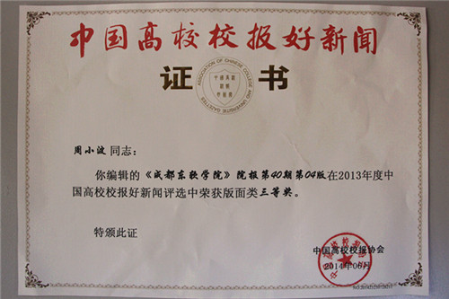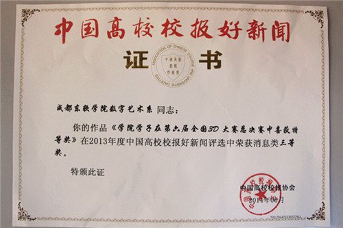 今年3月,中国高校校报协会举办的“中国高校校报好新闻”评选活动如期举行,全国共28个省市自治区的624所高校参加了本次评选。学院共组织5项作品参加本次评选。最终,经中国高校校报好新闻评委会的评审,学院新闻《学院学子在第六届全国3D大赛总决赛中喜获特等奖》荣获好新闻消息类三等奖;《今年会jinnianhuicom报》第40期第04版荣获好新闻版面类三等奖。