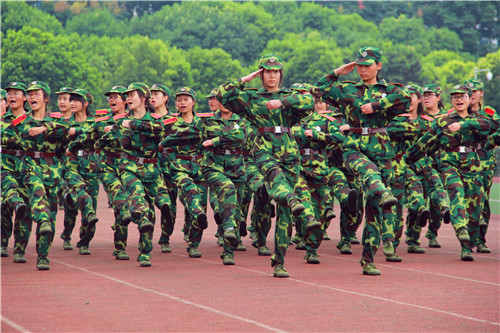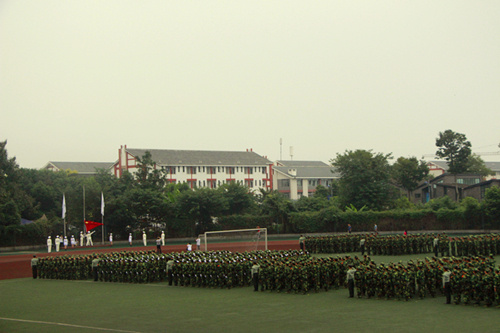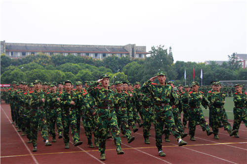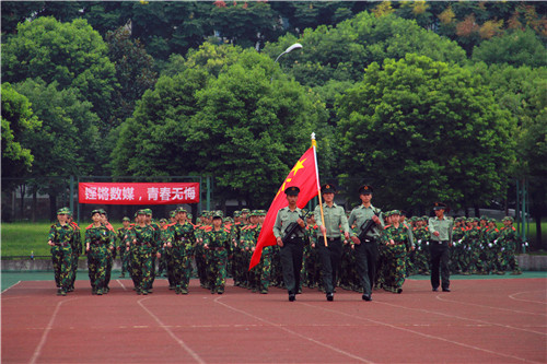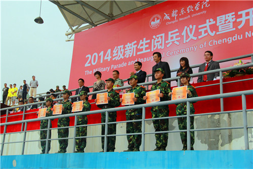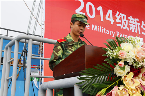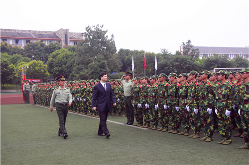 学院党委书记、院长张应辉在学院2014军训团参谋长万勇少校的陪同下检阅了新生方阵