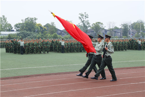 参训部队首长中国人民解放军78187部队副大队长蒋海滨中校为典礼致辞。他表示,学院参训同学在军训中不怕苦不怕累,体现了当代大学生应有的精神面貌,希望同学们能在以后的学习和生活中继续发扬坚持不懈、不怕吃苦的精神,面对困难,迎接挑战。