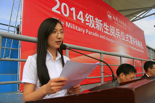 随后,学院2014级产品造型专业朱珂同学代表新生发言。她表示,虽远离家乡,但心怀温暖。在这个小型社会中磨练,我们便要学会树立正确的人生观、价值观,努力提高自身素质,积极参与各项活动,不断创新和改善自我修养。