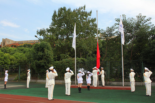 阅兵式在全场起立奏唱国歌中拉开序幕。护旗手身着国旗护卫队礼服,伴着优美的校歌旋律,迈着矫健的步伐,高举校旗,英姿飒爽的从主席台前走过。