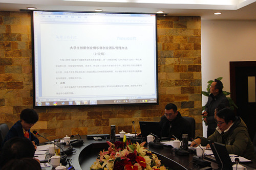 接着,学院大学生创业中心教师谢斌详细介绍了学院大学生创新创业俱乐部创业团队管理办法,并与参会人员进行了交流与讨论。