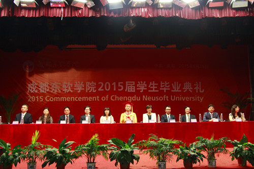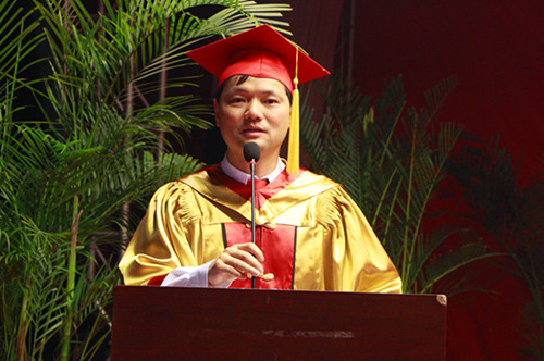 典礼最后,学院党委书记、院长张应辉发表讲话。首先他代表学院向毕业生表示衷心的祝贺,同时也对同学们表示由衷的感谢,感谢大家选择东软,为校园增添活力,创造了学院一个又一个的精彩!在毕业之际,他向同学们寄予了深切的希望:希望大家在未来的人生中不要害怕犯错,因为犯错是年轻的特权,重要的是能够直面自己的错误并且认真改进;希望大家保持东软人特有的个性和激情,坚持自我,尊重他人,大胆地描绘自己人生的蓝图;希望大家勇于创新,敢走别人没走过的路,开疆拓土,创造出属于自己的天地;还希望同学们乐观积极,懂得感恩,在建设自己生活的同时,能帮助别人成就精彩的人生!他还与同学们分享了两点认识:要认识到我们都不是“思聪”,所以脚踏实地拼搏奋斗很重要;要认识到我们也不可能都成为马云,所以看清自我知足常乐很重要,但是,踏实不代表不敢想,知足也不代表没大志,同学们要脚在土里,心在天上。最后,他祝愿同学们都能用自己的创新创意,去创造和建立属于自己的生活,在未来的日子里找到一份满意的职业,打拼出一番成功的事业,实现自己的人生价值,成就积极、向上、健康、精彩的人生!