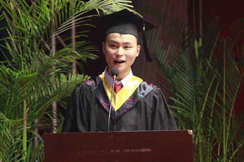 接着,计科系学子黄齐川作为毕业生代表上台发言。他首先代表全体毕业生向辛勤的老师及亲爱的亲友表达了衷心的感谢和敬意。他讲到:“今天,我们将要从红大门走出,开启人生新的一程。我们的内心饱含着对于母校的感恩之情,我们的行囊里更装满母校的教诲。告诫我们要脚踏实地,勤勉自强;告诫我们要心存高远,坚守理想;告诫我们要承但责任,做中华之脊梁!”最后,他再次向老师及亲友表达感谢并祝愿母校越来越好。