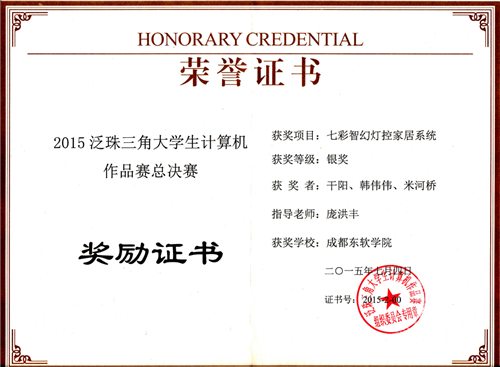 学院12级软件工程韩伟伟同学、12级嵌入式干阳同学以及12级软件工程米河桥同学三人组成的“寒舍”团队,凭借作品“七彩智幻灯控家居”斩获本次大赛银奖。