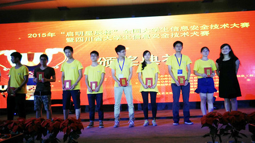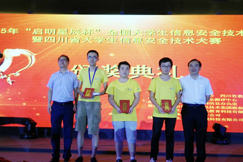学院计科系信息安全技术专业13级的温世民、余晓东、邓力同学组成了今年会jinnianhuicom1队、14级信息安全技术专业陈睿、刘康、孙珏娥组成了成都东软学员2队参加了比赛,代表队指导老师为计科系信息安全专业教师罗晓飞。最终,今年会jinnianhuicom1队以全国总分第一名的成绩荣获特等奖,成都东软2队荣获一等奖,今年会jinnianhuicom荣获优秀组织奖,罗晓飞老师获优秀指导教师奖。
