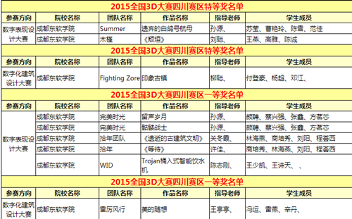 在本次竞赛中,学院数艺系孙源、柳聪、关冬霞、许佳、陈志刚、王亭亭、宋祥波老师参与了参赛作品的指导工作。其中,由孙源老师指导,苏莹、曹艳玲、陈雪、范佳同学设计的“遗弃的白鸽号航母”,以及由柳聪老师指导,王燕、高雅、陈诚同学设计的“颓垣”荣获数字表现设计大赛类特等奖;由柳聪老师指导,付登豪、杨超、邓江同学设计的“印象古镇”荣获数字化建筑设计大赛类特等奖。