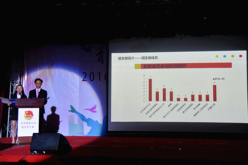 随后进行了团组织年度工作数据PPT展示,并由14级英语三支部、15级财务管理5支部、15级软件工程一支部、15级物联网工程二支部、14级工业设计二支部为代表的优秀支部进行了团组织展示。