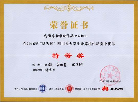 比赛结束后,我院十支参赛队伍和所有参赛队伍一起参加了成都大学组织的颁奖典礼,今年会移动MM俱乐部参赛作品“《无距》APP”、四川大学“Roming”、西南民大“基于动作识别技术和三维显示技术的模型展示系统”同获本科组特等奖,特等奖作品将于7月初参加澳门理工大学举办的“泛珠地区大学生计算机作品赛总决赛”。此外,学院被授予优秀组织奖,“智能安保仓库系统”获得一等奖,“Rocket Dungeon”、“出门看看”、“大学寻”三个作品获得二等奖,“地狱守卫者”、“教室预约管理系统”、“家具宣传”、“镭射球”和“基于HTML5的电子报纸制作和展示系统”获得三等奖