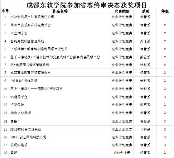 此次比赛四川省共有2000余件作品参加角逐,最终64所高校700多件作品入围终审决赛。从整个比赛开始到闭幕,学院学子积极备战,努力进取,学院从2015年10月份就开始举办校赛,同学们创新创业激情空前高涨,全院有进90支队伍进行校赛评比,通过校内专家评审,最终有30支队伍获得了参加省赛的资格,学院报送的30支队伍中18支进入了终审决赛,最终信管系何律洁等同学的《小驴创世界户外有限责任公司》获得了创业计划类的金奖,《简阳市安乐乡农村电商平台》等7支队伍获得了银奖,《“铁壁云”操作系统》等10支队伍获得了铜奖,学院也以总积分1010分的总成绩在入围高校中排名第十五位。在学院领导和各系部的大力支持下,通过全院师生的共同努力,学院在比赛中同时取得了量与质的突破。