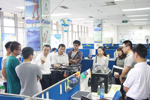 学院副院长康桂花首先带各位领导参观学生的创业基地,介绍了大学生创业中心的组成结构并展示了无人机、传感器、智能灯泡等一系列创新研究成果。程均副处长亲自体验VR,感受立体环境,考察小组领导还与创业大学生热聊3D打印。