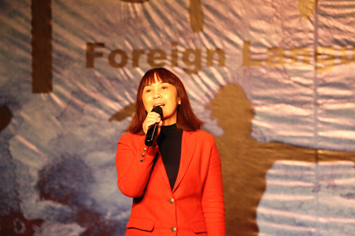 学院副院长康桂花讲话。她首先对外语文化节的举行表示热烈的祝贺,然后谈到随着经济、互联网+、创新创业的发展,学习外语文化才能取得自身发展和走向世界,并且在学习外语文化的同时还要弘扬中华文化。
