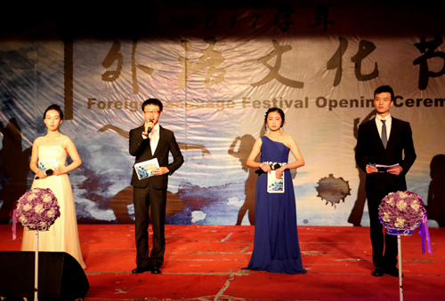 开幕式于19:00正式拉开帷幕,四位学生主持人上场,用汉、英、日三种语言介绍到场领导并做开幕引导。接着以视频形式回顾了上一学年外语文化节概况及外语系学生在各类比赛和活动中所取得的成就。