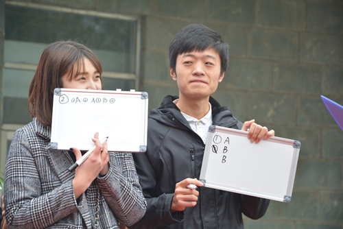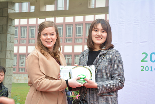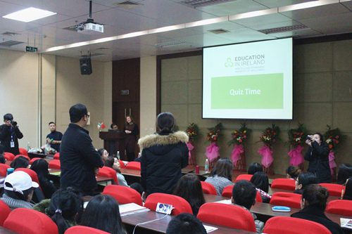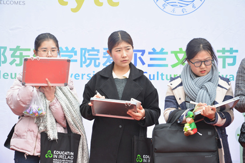 开幕式结束后,“玩味爱尔兰”有奖文化知识大赛开始。主持人现场随机抽选10位同学上台参与有奖问答,同学们纷纷踊跃参与,现场气氛火爆。参赛同学在答题板上写下自己的答案,通过计算得分逐轮淘汰决出前四名。赛后,老师们给获胜者颁发奖品,Niamh Madde女士为第一名颁奖并合影留念。