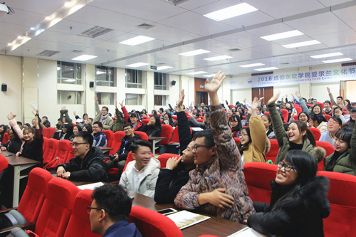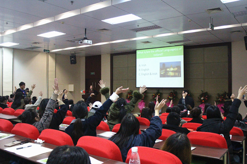 活动进行互动环节,同学们纷纷踊跃提问并积极回答Niamh Madden女士提出的问题,嘉宾们为同学们送上了精美的小礼品,活动现场轻松而热烈。