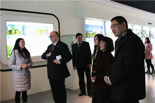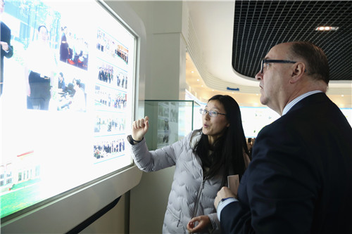 首先,爱尔兰驻华大使康宝乐一行参观了学院校史陈列馆。由专业外文校史陈列讲解员为其讲解学院的发展历史、学院特色和教学成果。客人们对学院TOPCARES-CDIO一体化人才培养模式、国际交流合作和学院师生的竞赛成果赞誉有加。