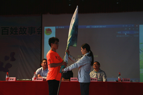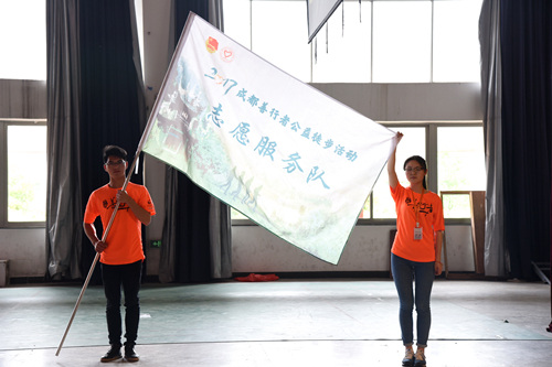 共青团四川省委社会联络部副部长肖剑春为2017成都善行者志愿服务队授旗,由志愿者服务队队长接旗。