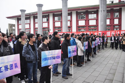 为了加强大学生计算机基础理论教育,提高学生的计算机操作能力和就业竞争力,学院专门针对《大学计算机基础》课程进行了TOPCARES-CDIO教学改革。根据教改方案,学院于12月26日下午在A4教学楼外广场举行了学院首届计算机文字录入大赛总决赛暨颁奖典礼,该项大赛由教务部、学工部、计算机科学与技术系具体承办。学院副院长曹云凤教授,党委副书记、副院长张宪民,院长助理兼教务部部长康桂花及各系主要负责人和教师参加了此次颁奖典礼。此外,共有203位同学参加了此次总决赛。颁奖典礼由学工部部长程学良主持。